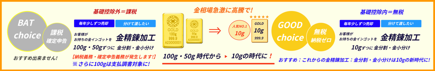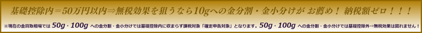 ※金以外の譲渡益がない場合、25gなら現在の金相場なら無税、100gでは現在の金相場では課税対象、50gでも金相場の上昇しだいで10,703円/gから課税対象。ただし500g・1Kg売却に比べたら大幅な節税になります。