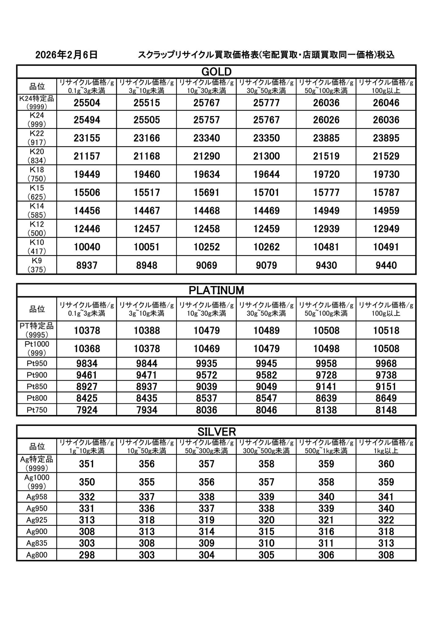 ※下記価格は宅配買取・店頭買取における金製品0.1g・プラチナ製品0.1g・銀製品1g以上に対しての適用価格(税込)です