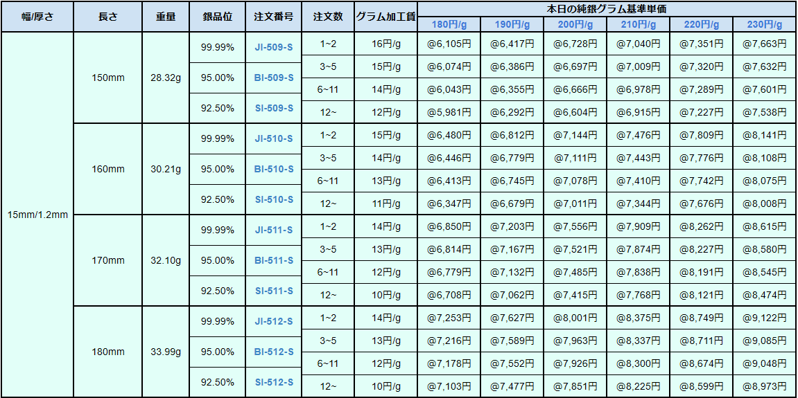 バングル用カット銀板ⅩⅡ(10mm~20mm)バングル用純銀板・バングル用950銀板・バングル用925銀板:井島貴金属精錬株式会社