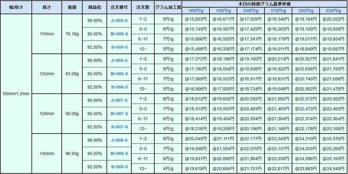 シルバー9999、シルバー950、シルバー925ソフトシートの販売価格は、4N純銀をベースに計算されています。950銀、925銀は同一価格での販売となります。