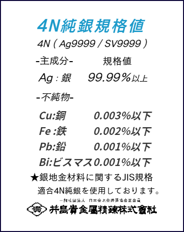 | 4N純銀 | 成分分量規格 Ag 99.99%以上 Cu 0.003%以下 Fe 0.002以下 Pb 0.001以下 Bi 0.001以下 |